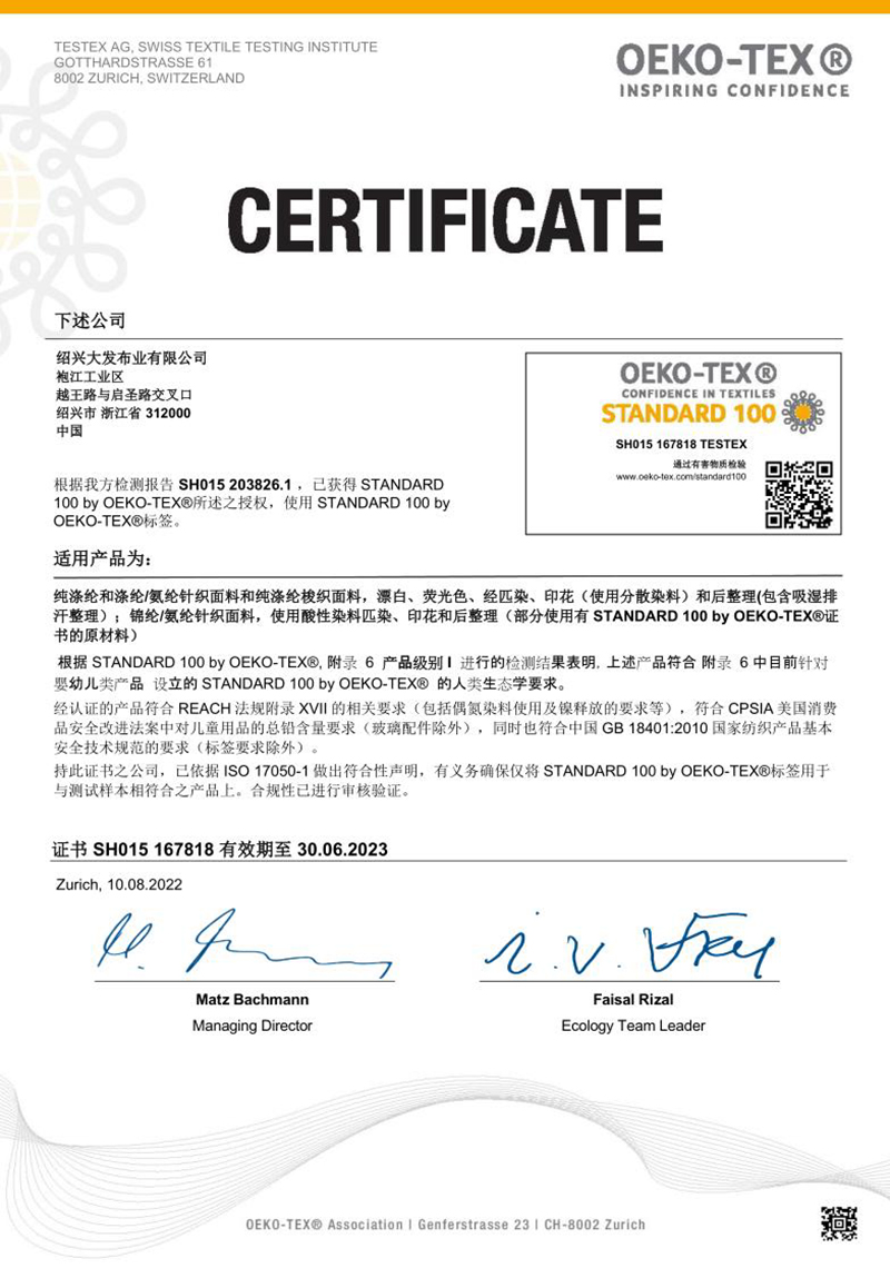 DAFA成立于2003年,現已發展為一家集研發、生產與國際貿易于一體的高端紡織綜合企業,始終專注于創新驅動、卓越品質與可持續發展。公司配備完善的CNAS標準自有研發中心,并布局針織、染整、印花等全流程制造工廠,協同全球貿易體系,為國際一線品牌提供高性能、定制化的面料解決方案。所有運營環節均嚴格遵循國際規范,先后通過OEKO-TEX?GRSGOTSDisney FAMAHigg FEM等多項全球權威認證。